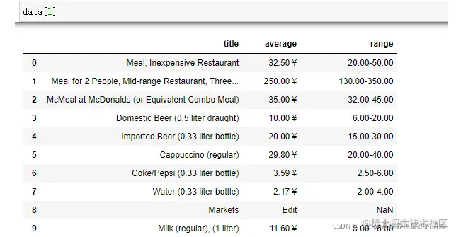 import pandas as pdpd.set_option('display.max_rows', None)pd.set_option('display.max_columns', None)data = pd.read_html("https://www.numbeo.com/cost-of-living/in/Beijing", header=None)