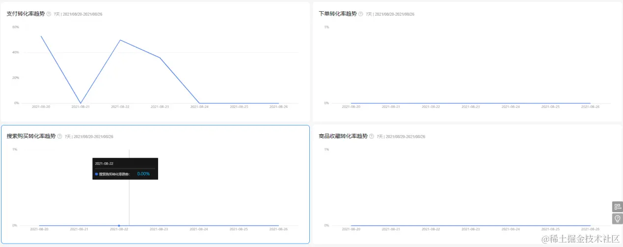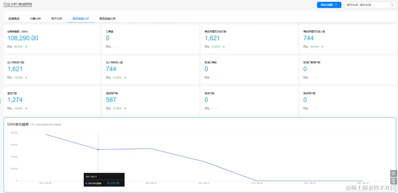 在商品销售分析模块,数据概览区直观展示了商品成单销售额、订单量、商品详情页等基础销售数据。卡片区域,可通过GMV变化趋势判断近期的营收情况。除了总体的营收情况,电商行业更需要关注各种转化率,如支付转化率、下单转化率等。当支付转化率上升时,说明商品或者营销活动对用户产生了吸引力。转化率也可以结合华为分析中的漏斗分析,建立转化漏斗进行下钻分析。