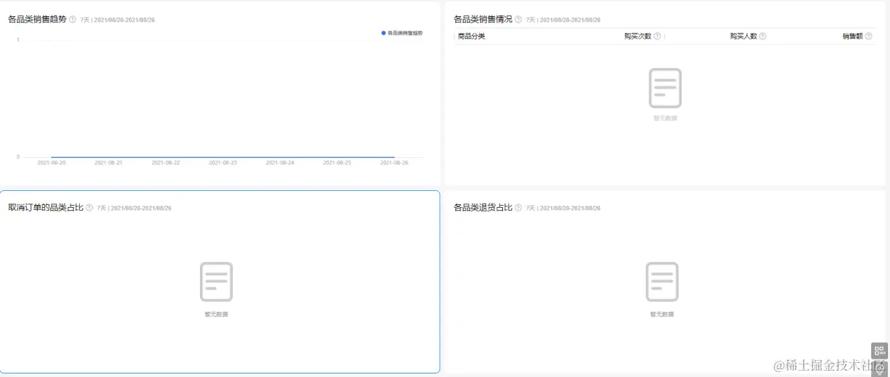 通过商品销售品类看板,运营人员可以快速掌握商城内各类商品的销售收入贡献,如各个商品购买人数、销售额等。从取消订单的品类占比、各品类退货占比、各品类收藏占比等数据,可帮助运营人员判断哪些为爆款商品从而加大资源投入,对于退货、取消订单较多的产品,可能需要思考商品是否不受用户欢迎。