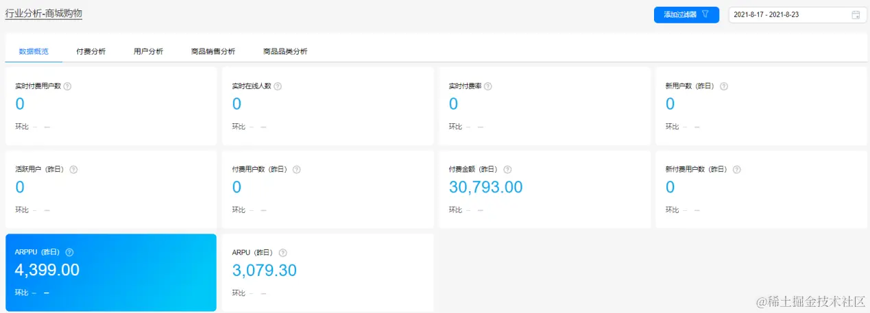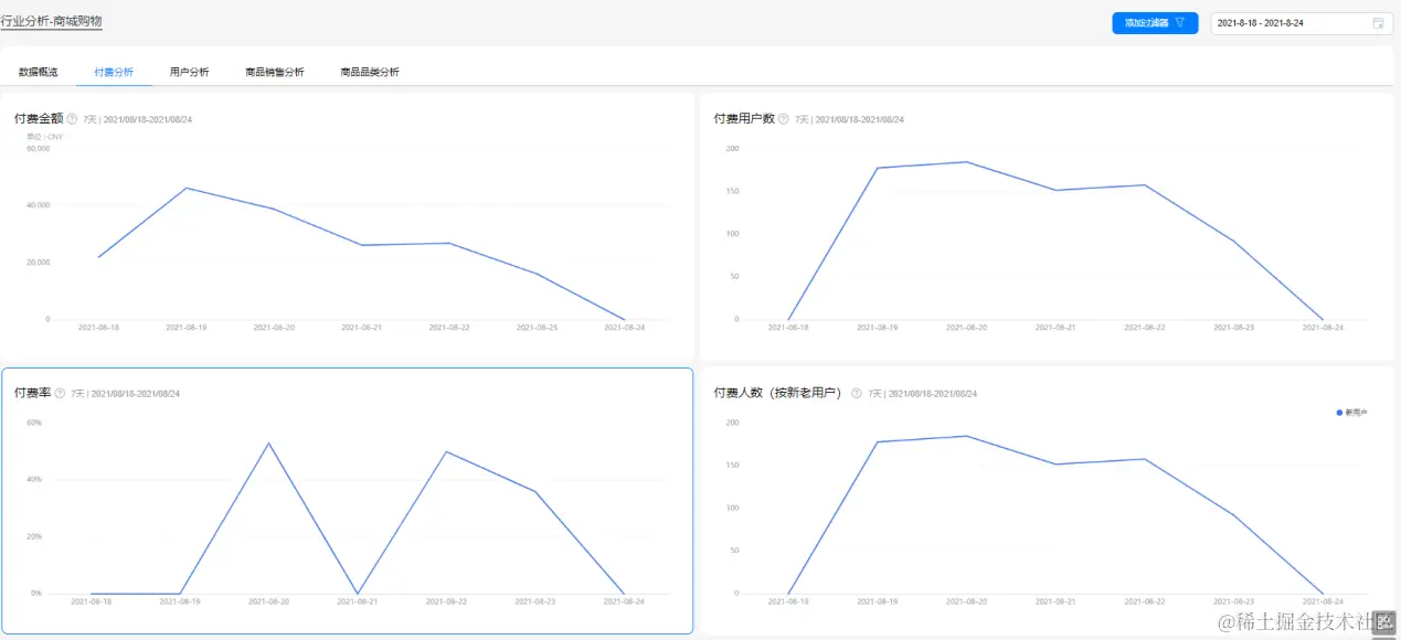 对于电商行业来说,付费情况是衡量产品经营状况最直接的指标之一。在付费分析报告页面,运营人员可直观看到付费金额、付费用户数、人均付费金额等情况,并且支持根据过滤器和时间段筛选人群。如某购物类APP想查看活跃用户的付费情况,在“添加过滤器”控件筛选受众“活跃用户”即可查看相应报告。