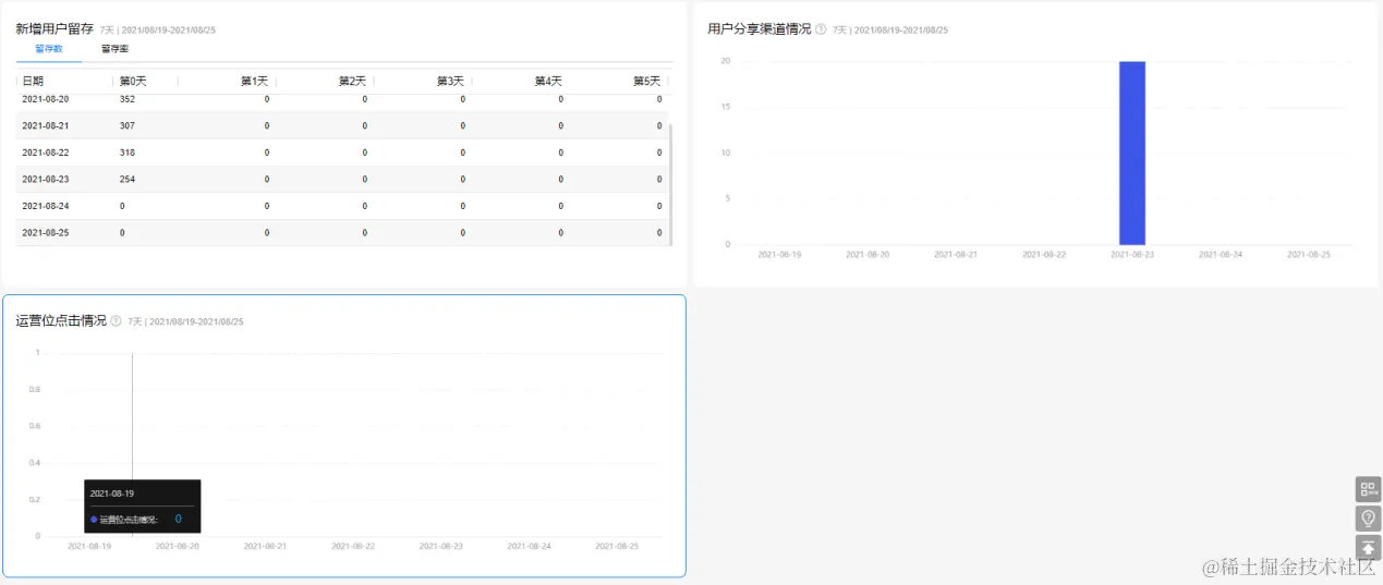 在用户分析报告页,从活跃用户数、活跃用户登录时段分布、每日回流数、人均登录时长、单次登录时长均值、新用户数、活跃用户留存、新增用户留存等展示了用户的新增、活跃及留存等情况。另一方面,运营人员可以从用户分享渠道情况、运营位的点击情况判断各分享渠道及坑位素材对用户的吸引力。