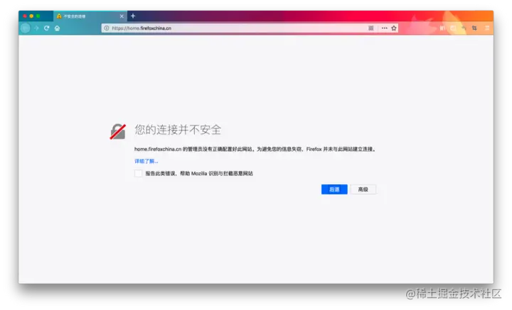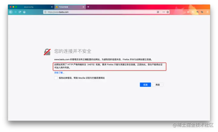 出现这个「您的连接并不安全」那么很多的使用者说可以通过配置Firefox浏览器配置即可,但是根据测试发现这个方法行不通!