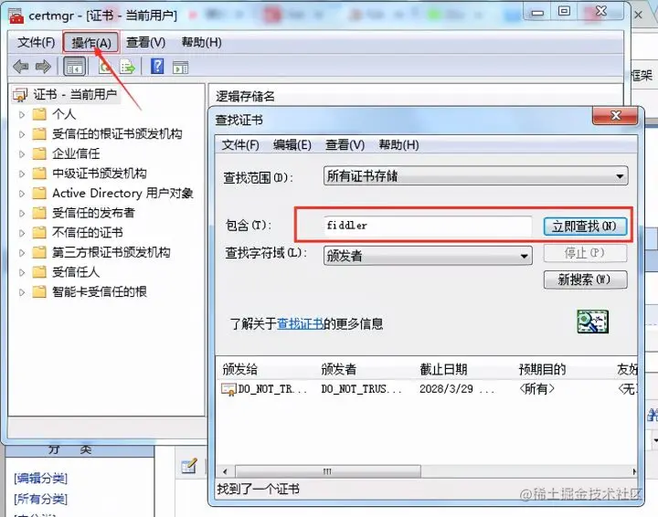 2.清除电脑上的根证书,WIN+R快捷键,输入:certmgr.msc, 然后回车,查找所有fiddler证书,然后删除。(首次安装fiddler请忽略)