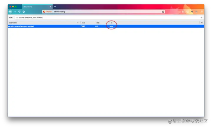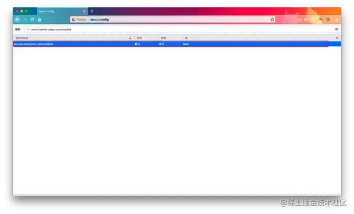 在「搜索」栏输入 「security.enterprise_roots.enabled」找到对应的配置项
