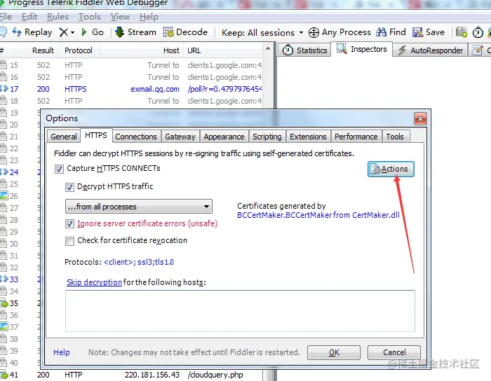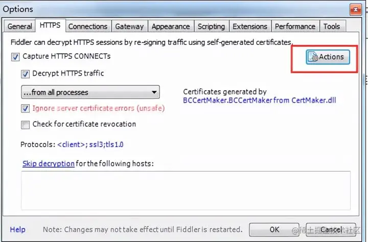 4.打开fiddler,点击工具栏中的Tools—>Options,点击Actions,选择最后一项,Reset All certificates,然后关闭