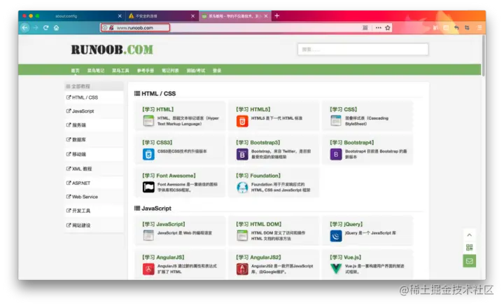 可以看到当访问 「菜鸟教程」这个站点时一点问题没有!那既然访问传输协议为 「https」的站点时会有这样的提示:此网站采用了 HTTP 严格传输安全(HSTS)机制,要求 Firefox 只能与其建立安全连接。正因如此,您也不能将此证书加入例外列表。