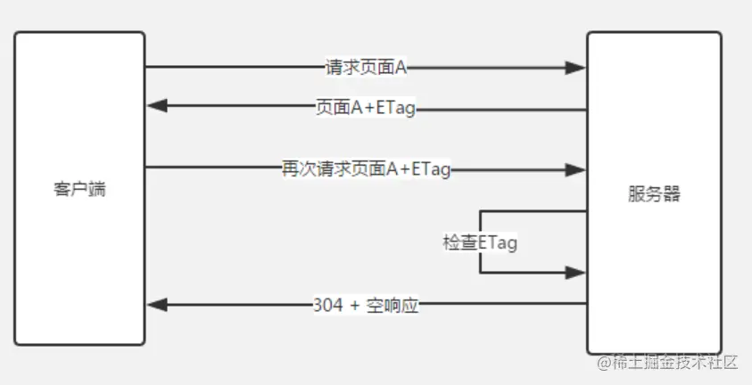 服务器根据实体内容生成一段 hash 字符串,标识资源的状态。浏览器会将这串字符串传回服务器,验证资源是否已经修改,如果没有修改,就返回304, 过程如下: