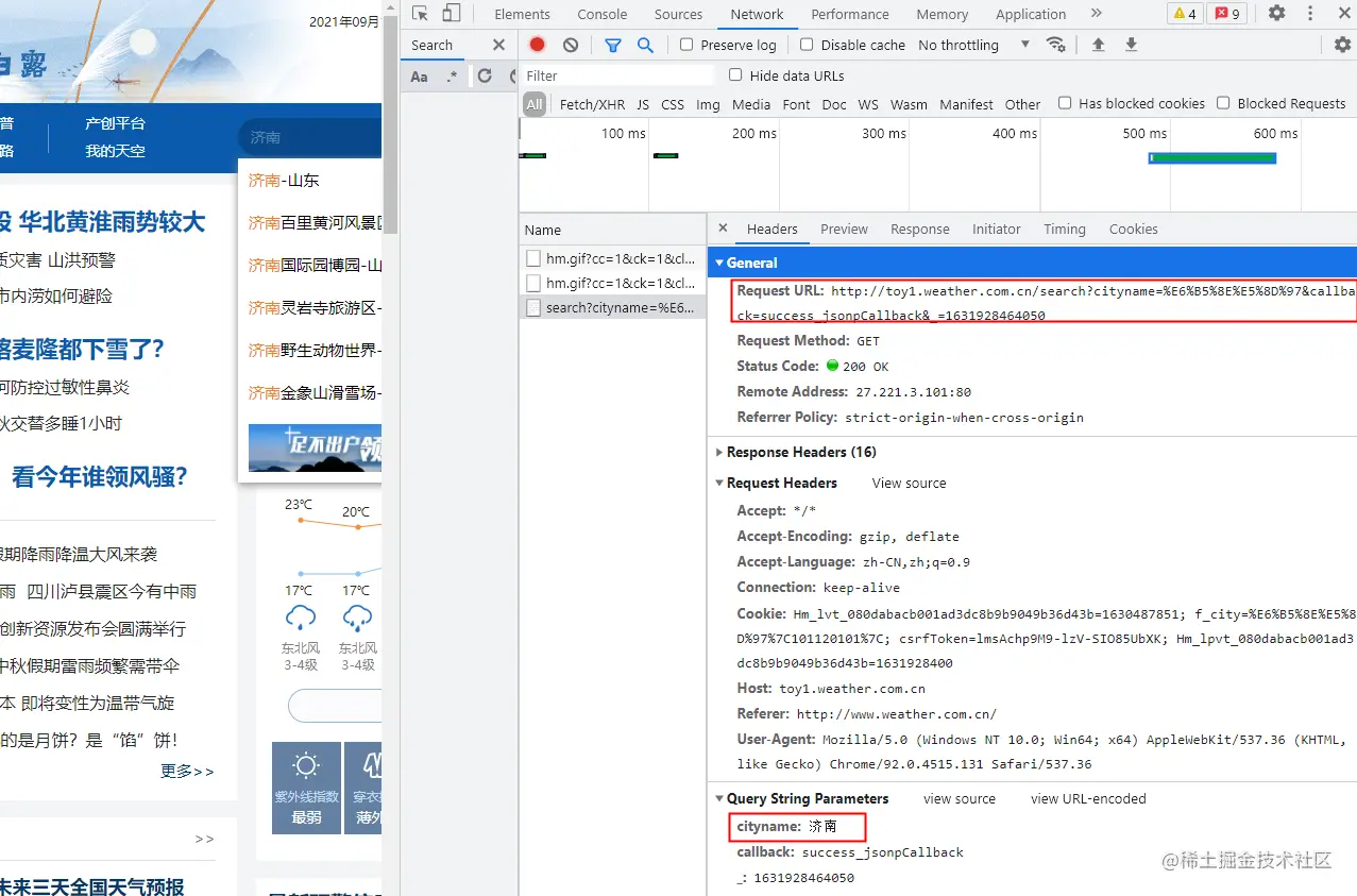 我在主页发现了这个城市搜索栏。发现了搜索时会发送这个链接 toy1.weather.com.cn/search?city…济南: