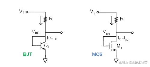 电流镜电路的实现看起来很简单,但有很多事情要做。电流镜的简单两个晶体管实现基于以下基本关系:在相同温度下,具有相同V GS (用于 MOS)或V BE (用于 BJT)的两个相同尺寸的晶体管具有相同的漏极或集电极电流。为了最好地理解这个重要的电路构建块以及它如何利用这种关系,我们需要将电路分解为输入和输出部分,并依次检查每个部分。