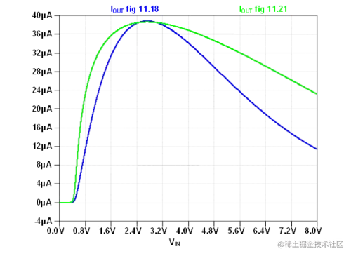 如果我们将图 11.1.1(b)中的 I 至V转换器的输出连接到V图 11.1.2 中的 I 转换器。当两个电阻相等时,I OUT将是 I IN的镜像。请注意,实际上不需要第二个运算放大器,因为两个 NMOS 晶体管的栅极可以直接相互连接,结果相同。请记住,两个相同尺寸的晶体管在相同温度下具有相同的V GS(或V BE对于 BJT)具有相同的漏极电流。这是对电流镜概念的重要简化。