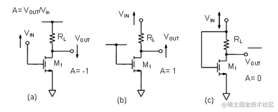 或者。如果栅极保持固定在相同的直流偏置电平,产生与 (a) 中相同的漏极电流,并且输入信号施加到负载电阻器 R L的顶部(图 11.14(b)),则增益将为加1。也就是说,如果晶体管的漏极/源极输出阻抗被忽略。如果我们现在将栅极连接到电阻器 R L的顶部,如图 11.14© 所示,叠加两条路径的净增益将为 1 - 1 = 0。