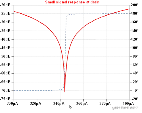 使用增强型 NMOS 2N7000 晶体管制作的零增益放大器进行了仿真,其中在扫描漏极电流时计算小信号 AC 增益和相位。从图 11.17 中可以看出,增益曲线在 345uA 附近有一个急剧的零点或下降。这也发生在相位从 0 度急剧转变到 180 度的点上。