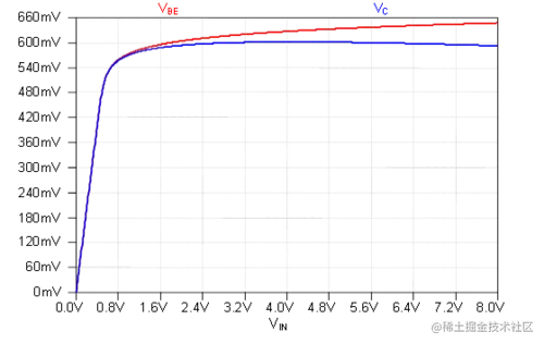 在图 11.15 中,我们有一个 NPN 晶体管偏置导通,其集电极电压V C小于基极电压V BE热电压V T = kT/q,(等于 Ic 乘以 R L)并且基本上恒定从V IN施加的输入电压变化。图 11.14中绘制了V BE和V C处的电压与V IN处的施加电压的关系图。正如我们所见,当V BE继续上升时,V C保持稳定得多,实际上下降到V IN的某个水平以上。