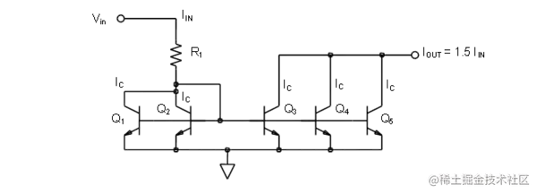 如果在反射镜的输入侧并联 N 个相同的器件,并在输出侧并联M 个器件,则反射镜的增益为M /N。在图 11.4.1 中,我们看到一个示例,其中 2 (N=2) 个设备在输入端连接在一起,3 个 ( M =3) 个设备在输出端连接在一起。因此,镜像增益将为 3/2 或 1.5。由于所有五个晶体管共享相同的V BE电压,因此它们的集电极电流 I C将全部相等。输入电流 I IN在 Q 1和 Q 2 中均分,使得: