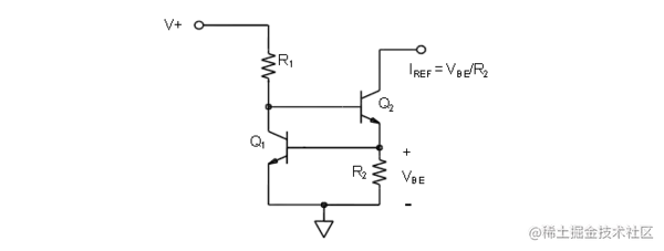 图 14.1(a) 的简单二极管连接晶体管 的V BE电压也可用于生成调节电流参考,如图 14.3 所示。在该电路中,Q 1周围的简单二极管连接由射极跟随器 Q 2代替。Q 1的V BE施加在R 2 上,由此产生的电流流经Q 2成为I REF,忽略Q 1和Q 2的基极电流。