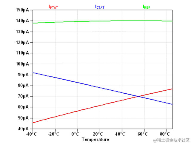 如果我们在某个标称温度下将 PTAT 和 CTAT 电流设置为大致相等 (70uA),那么这两个电流的总和 (140uA) 与温度的关系将大致平坦,如图 14.5 中的模拟图所示。
