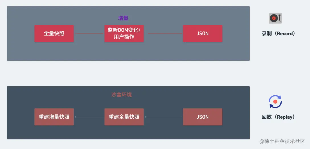 然后在页面发生视图变动时(DOM 变化和用户操作),记录增量数据,完成页面的录制,然后保存到远程服务器。