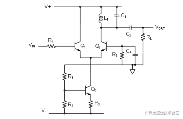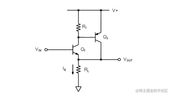 R的值1是良好的线性是至关重要的,因为它设置I Ç晶体管Q 1。Q 1的集电极电流将近似等于Q 2的V BE除以R 1。Q 1 中的这个电流将比R L 中的电流相对更恒定。R L 中的大部分可变电流(随着V OUT变化)将流入 Q 2而不是 Q 1。电阻 R L 当然可以另外用恒流源代替作为进一步的改进,正如我们在 16.1 节中看到的那样。