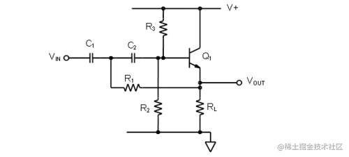 滤波器组件包含在从电路输出到输入的负反馈中。构成有源滤波器网络的元件由 C 1、C 2、R 1以及 R 2和 R 3的并联组合组成,假设射极跟随器电路的输入电阻非常高,可以忽略不计。
