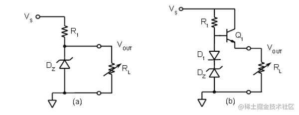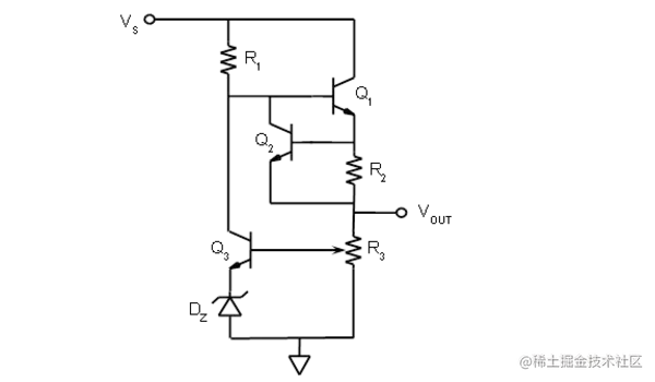 其中,V Z是齐纳电压,I B是晶体管的基极电流,K是 1.2 到 2 的比例因子,以确保 R 1足够低以在重输出负载电流下实现最大 I B。