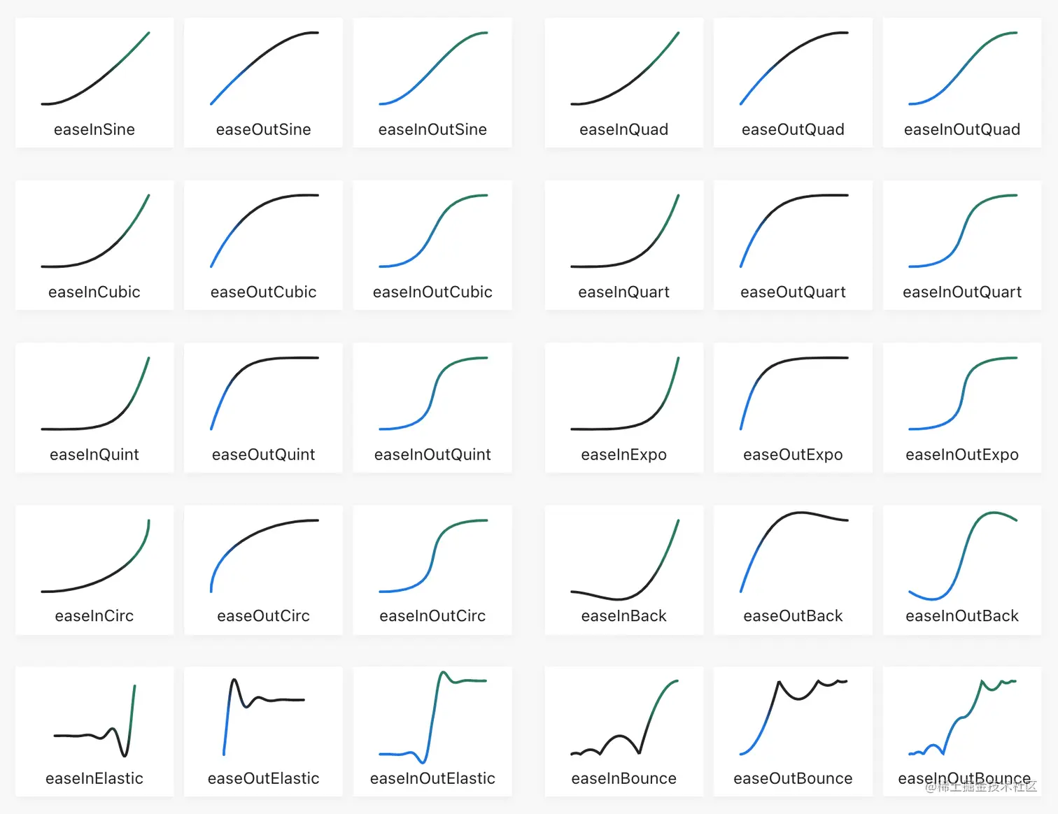 缓动函数并非特定的某一个函数,它有不同的拟合方式,不同形式的拟合效果可以参看下图: