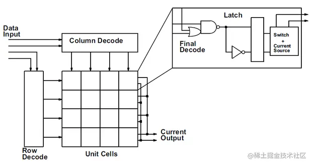 对大量小型设备使用统计平均将提高匹配性能。有多种方法可以安排电流源和组成它们的各个设备。图 7 显示了一种可能的平面图,其中每个单元包括输出开关对、电流源,可能带有共源共栅,以及最终的重新定时锁存器和最终的解码逻辑门 [2]。这些单位单元以二维阵列或矩阵排列。每个单元格中额外器件所需的面积增加了电流源器件之间的距离。正如我们从表 1 中看到的那样,这会导致精度方面的劣势。参考文献 [2,12] 中的两个示例均使用 256 个单位元素来表示 8 个 MSB;然而,报告的线性度几乎有 10 倍的差异。