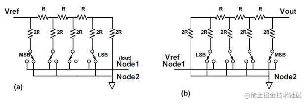 R-2R 或梯形架构简化了电阻匹配要求,因为只需要两个电阻值,比例为 2:1。R-2R 架构可用作电压或电流模式 DAC。大多数 R-2R 电流模式架构都基于图 4a 中所示的电路。外部参考施加到 Vref 引脚。R-2R 梯形图将输入电流分成二进制加权电流。根据数字输入,这些电流被引导到节点 1 或节点 2。电流输出节点通常连接到配置为电流电压转换器的运算放大器。出于匹配的原因,运算放大器反馈电阻通常包含在 DAC 芯片中。开关始终处于接地电位,它们的额定电压不会影响参考电压额定值。如果开关设计为在任一方向承载电流,则可变信号或交流信号可用作参考,从而产生乘法 DAC。Vref 的输入阻抗恒定且等于 R。 这种架构的缺点包括需要正负电源的运算放大器引入的反相,以及运算放大器的复杂稳定性,如 DAC 输出阻抗,见下图节点 1,随数字输入而变化。电流模式操作也会导致更高的毛刺,因为开关直接连接到输出。电压模式 R-2R DAC 在 Vref 和地之间切换电阻。参考电压施加到节点 1。梯形图上的每个梯级提供一个二进制标度值,输出作为梯形图末端的累积电压,如图 4b 所示。输出电压具有恒定阻抗,简化了放大器的稳定性。正参考电压将提供正输出,因此单电源操作是可能的。开关电容产生的毛刺被最小化。缺点是参考输入阻抗变化很大,因此必须使用低阻抗参考。此外,开关从接地到 Vref 工作,限制了参考的允许范围。