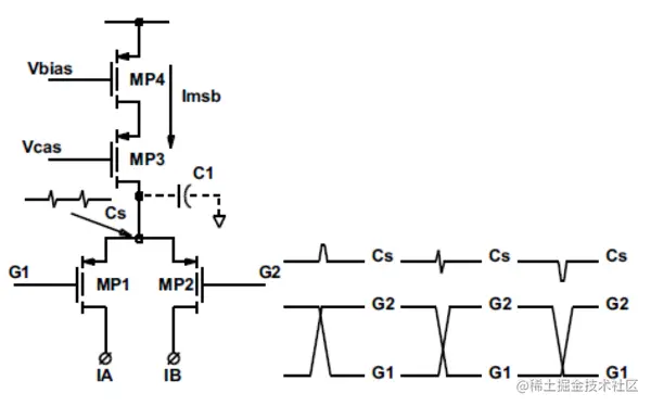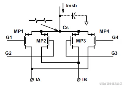 对于给定的时钟周期,门将是高电平和低电平。每个时钟周期,低电平的门将转换为高电平,另一个门将转换为低电平。在图的底部,输出 IA 和 IB 指示当前 Imsb 的方向。IA 和IB 的输出在逻辑上与普通差分开关相同。即使电流不改变输出,也会出现如图所示的切换毛刺。以这种方式进行切换消除了由于脉冲持续时间不均匀引起的非线性,就像在 RZ 切换中一样,因为每个脉冲都具有相同的宽度。每个时钟转换至少有两个且只有两个信号转换,一个上升,一个下降。通过开关两侧的不断切换,开关噪声现在移动到采样时钟频率。同样重要的是要注意,在公共源节点 Cs 上看到的开关干扰是恒定的并且与输入数据模式无关。然而,节点 Cs 上的电压仍会受到 IA 和 IB 处的摆动影响,就像在普通差分开关中一样。