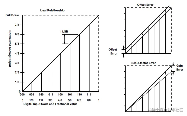 许多因素会影响静态或直流性能。增益误差是转换器传递函数斜率与理想传递函数斜率的偏差(见图 1)。失调误差是增益误差为零时 DAC 输出与理想传递函数的偏差。因此,所有输入代码的偏移误差都是恒定的。微分非线性 (DNL) 是每个输入代码的实际步长与理想 1- LSB的偏差步。DNL 错误会导致超出量化效果的附加噪声和杂散。积分非线性 (INL) 是实际输出电压与理想输出电压在传递函数端点之间绘制的直线上的偏差。INL 是在去除偏移和增益误差后计算的。INL 误差还会导致输出中的附加谐波和杂散。如果 DAC 的输出随着数字输入代码的增加而增加或保持不变,则该 DAC 是单调的。相反,如果输出随着数字代码的增加而降低,则 DAC 是非单调的。