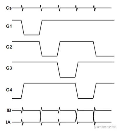 动态误差的另一个来源与以下事实有关:少量衰减的输出信号通过差分开关的 gds 泄漏到节点 Cs 上。在节点 Cs 处看到的信号幅度通常约为在输出 IA 和 IB 处看到的信号幅度的 1/20,或者对于 1 V输出摆幅为50 mV。每个开关元件在传递函数中的不同点打开,因此在节点 Cs 上将具有不同的波形。在图 22a 中,显示了互补输出 IA 和 IB。参考图 21,当 MP1 打开时,节点 Cs 将具有 IA 的衰减版本,而当 MP2 打开时,节点 Cs 将具有 IB 的衰减版本。在图 22b 中,我们看到信号