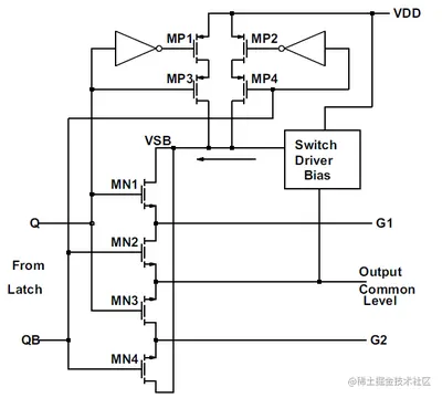 对于数据的每次转换,设备 MN1 或 MN4 从 VSB 节点汲取一个又大又窄的电流尖峰。通常,需要将开关驱动器偏置块设计为提供该电流并具有足够低的阻抗以在一个时钟周期内稳定回其标称值。这通常需要相当大的静态直流电流,增加了电路中的功耗,如参考文献。[1,7]。添加 PMOS 器件 MP1-4 以在发生数据转换时从 VDD 电源提供类似的窄电流尖峰。这允许开关驱动器偏置块设计为具有更小的静态电流。电路消耗的功率现在更多地是时钟频率和数据模式的函数。为了省电,两个逆变器,INV3,4,