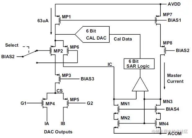 每个单元大约等于 14 位主 DAC LSB的四分之一。为了保持分裂阵列的面积较小并确保 6 位级别的单调性,前两位是温度计编码的,并由 3 个相等的 16× 分数生成。开关配置为将电流引导至 MP1 的漏极以增加单元的输出电流,或将电流丢弃至所有校准 DAC 共有的返回电流节点。被丢弃的电流返回的电压被缓冲放大器强制近似等于 MP1 的漏极,缓冲放大器由 MP1 的共源共栅偏置驱动。这确保拆分动作不受开关设置方式的影响。