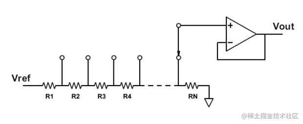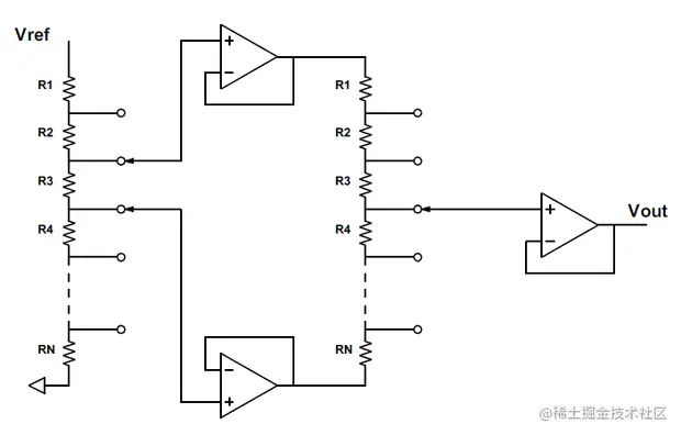 转换器的全分辨率分布在两个或多个子 DAC 的分段架构可用于电流和电压输出 DAC。电阻串分压器电路中解码电阻两端的电压可以进一步细分以构建电压分段 DAC。这种细分可以通过第二个分压器电路或什至使用不同的架构来实现,如图 3 所示。 只要各个段是单调的,并且图 3 中两个缓冲放大器的偏移量,整个 DAC 的输出就会保持单调3 个小于 1 LSB. 单调性很容易实现,因为各个段的分辨率较低。分段具有减少实现给定分辨率所需的电阻器(或电流源)数量的额外好处,从而允许更小的芯片尺寸。因此,对高分辨率 DAC 进行分段是很常见的。整体线性度仍由单个元素的匹配决定。