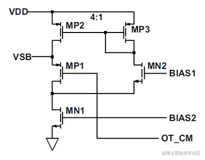 开关驱动器偏置发生器如图 25 所示。 PMOS 器件 MP1 被缩放以模拟输出开关之一。节点 VSB 上的电压将等于节点 OT_CM 上的电压(图 24 中的输出共模电平)加上MP1的V gs。由 BIAS2 驱动的 NMOS 器件 MN1 确定块中的总电流电平。MN1 的一部分电流被 MN2 分流,并通过 MP3 的镜像增益到 MP2(在这种情况下约为 3)向 MP1 的源提供电流。这种反馈提供了一定程度的调节并降低了节点 VSB 的动态阻抗。