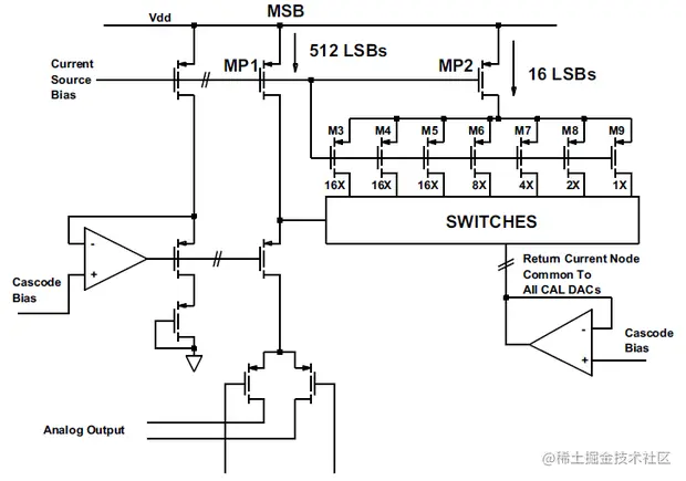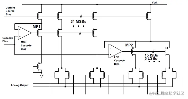 为了确保最佳微分线性度,应解决从MSB到剩余 LSB 总和的进位。对于低分辨率LSB段(4 到 5 位),矩阵中的单个晶体管可以以二进制方式组合以生成所需的电流值。对于更高分辨率的LSB段,实现此目的的一种流行方法是细分一个额外的MSB单元电流源,以提供 DAC 的其余低位。这确保来自所有 LSB 的总电流与 MSB 紧密匹配。可以使用分流晶体管阵列(子 DAC)代替MSB 中使用的单个共源共栅器件细胞。例如,一个 9 位子 DAC 分路器可以进一步分割成一个 4 位温度计编码的上段,并带有用于五个 LSB 的二进制加权元素。分流器栅极轨可由与MSB 共源共栅的控制回路分开的控制回路驱动,如图 10 [28] 所示,关闭电流源漏极上的回路。这样,即使有效共源共栅、MSB 的 MP1 和 LSB 的 MP2 具有潜在不同的V gs工作点,所有主要的MSB单元电流源工作点现在都匹配。