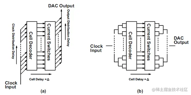 二叉树分布结构通常用于匹配这些延迟以及在参考文献中所做的。[5] 对于时钟速率为 1.4 Gsample/s 的 DAC。这导致如图 16b 所示的恒定波前。时钟分配树被安排为从驱动器到每个单元具有相等的长度。同样,输出集合树从每个单元到输出焊盘的长度相等。时钟树延迟不需要与输出树延迟匹配。布局中单位单元的物理布局是一个重要的考虑因素,布局的几何改组通常用于打破单元延迟中的任何线性梯度。(图 16)可能存在 [33]。