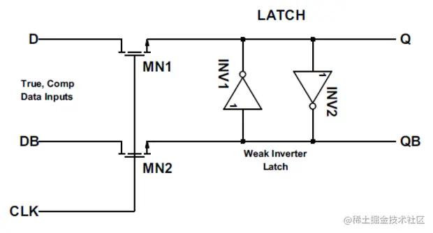 驱动 CLK 的缓冲器需要提供给晶体管 MN1 的栅极电流是输入 D 和输出 Q 上存在的相对电压电平的函数。如果 D 上的电压与 Q 上的电压相同,则需要稍少的电荷量如果 D 不等于 Q,则打开 MN1。MN3 在输入 D 处与 MN1 共享其漏极连接,但源极连接到 INV6 的输出。INV6 输出上的电压将与 INV1 相反,因为 INV6 的输入连接到 INV3 的输出,INV3 是输出 QB 的反相版本。INV6 是门控反相器,当 CLK 为高电平时输出将处于高阻抗状态,当 CLK 为低电平时将被驱动为高电平或低电平。