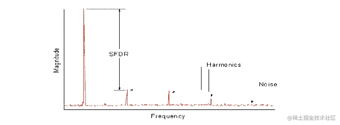 | 信噪比 (SNR) 或无谐波的信噪比。 | 与 SINAD 类似,均方根信号幅度与所有其他频谱分量(不包括前五个谐波和直流)的均方根的平均值之比。 | SNR 表示转换器与理想转换器相比的噪声性能。 |