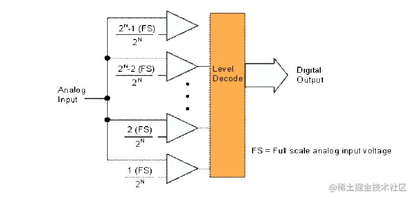 在闪存或并行 ADC 架构中,一组 2N-1 比较器将模拟信号转换为数字信号,分辨率为 N 位。比较器在一个输入端接收模拟信号,在另一个输入端接收参考电压的唯一部分。每个比较器的参考电压通常是电阻分压器的分接头,由此比较器以相当于 1 LSB 的电压增量偏置。比较器阵列同时计时。