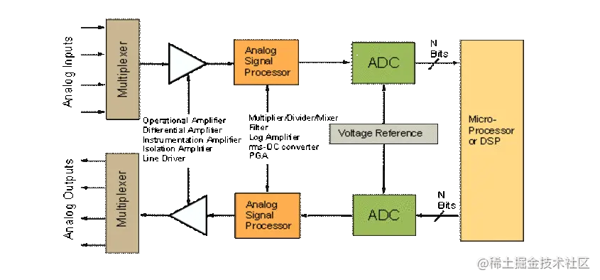 在许多情况下,模数转换过程只是更大的测量和控制回路中的一个步骤,在该回路中处理数字化数据,然后重新转换回模拟信号以驱动外部传感器。这些换能器可以包括诸如电机、加热器和扬声器等声学潜水器之类的东西。ADC 所需的性能将反映测量和控制回路的性能目标。ADC 性能需求还将反映环路中其他信号处理元件的能力和要求。