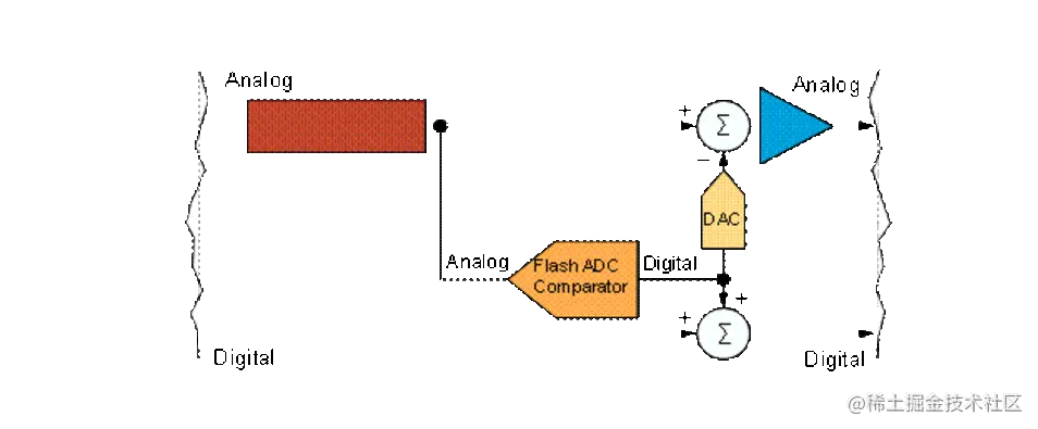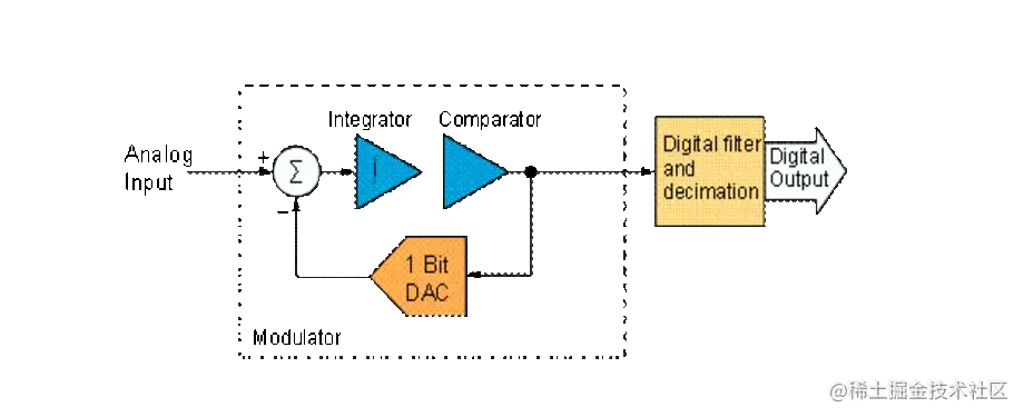 该架构的基本元素是积分器、比较器和一位 DAC,它们共同构成了 Sigma-Delta 调制器。调制器从模拟输入信号中减去 DAC,然后将信号馈送到积分器。积分器的输出然后进入比较器,该比较器将信号转换为一位数字输出。得到的位被馈送到 DAC,它产生一个模拟信号,从输入信号中减去。该过程以非常快的“过采样率”重复。