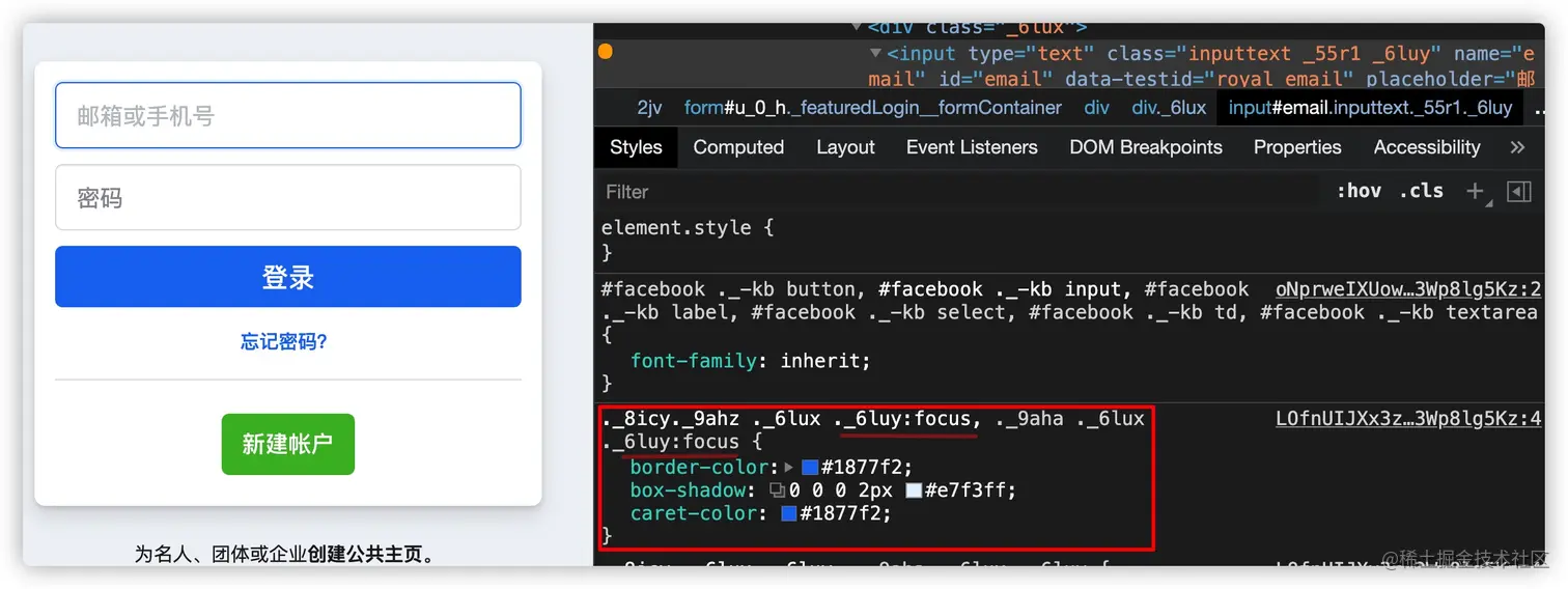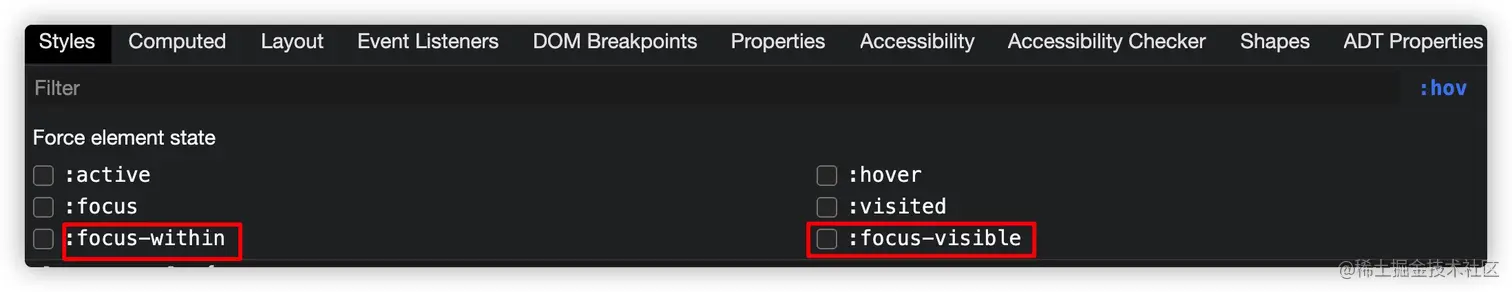:focus-visible:只有使用键盘的Tab键(或快捷键)触发焦点元素焦点环的样式。如果仅使用:focus-visible设置焦点环样式的话,那么用户使用鼠标点击焦点元素时不会触发焦点环样式