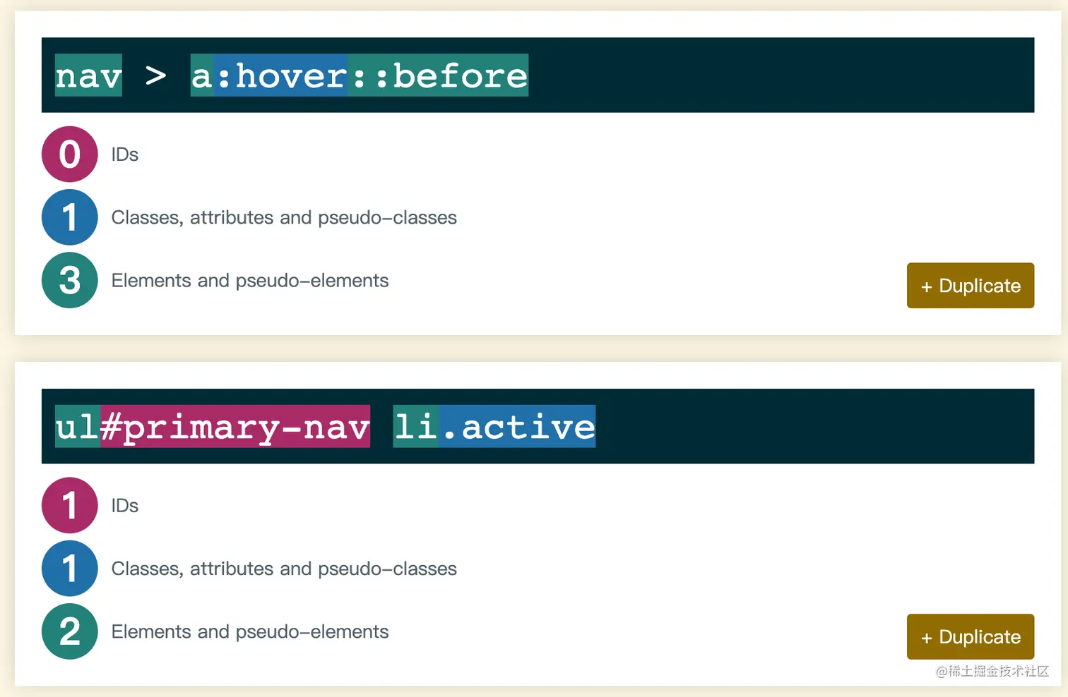 - D 的值等于 标签选择器 和 伪元素 出现的总次数 。