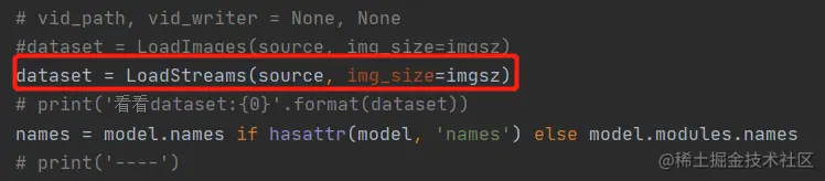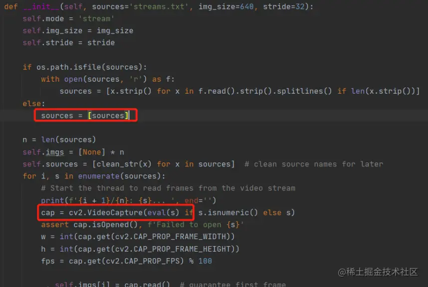 进入source参数里面查看,发现里面有一个默认的值,就是读文件,如果不是文件,就把source=[source],再进行source值遍历。在遍历中还使用到了opencv打开本地电脑的摄像机流,再开一个线程进行实时行人识别。