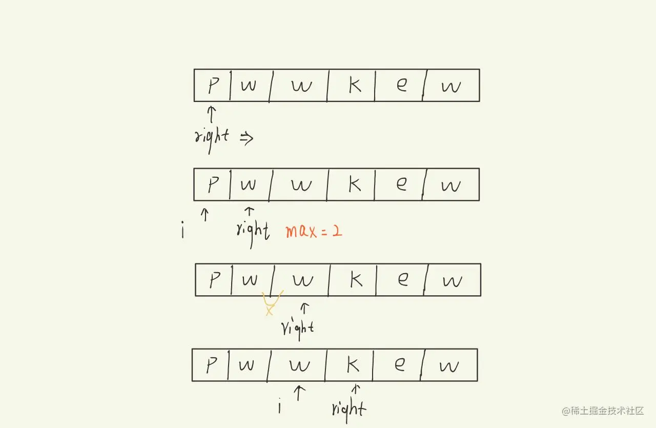 我们结合双指针,我们右指针不断向前遍历,将遍历到元素存入哈希表中,当哈希表中遇到重复元素时,做指针开始移动,移动到重复元素的下一位停止,右指针再一次开始运动。