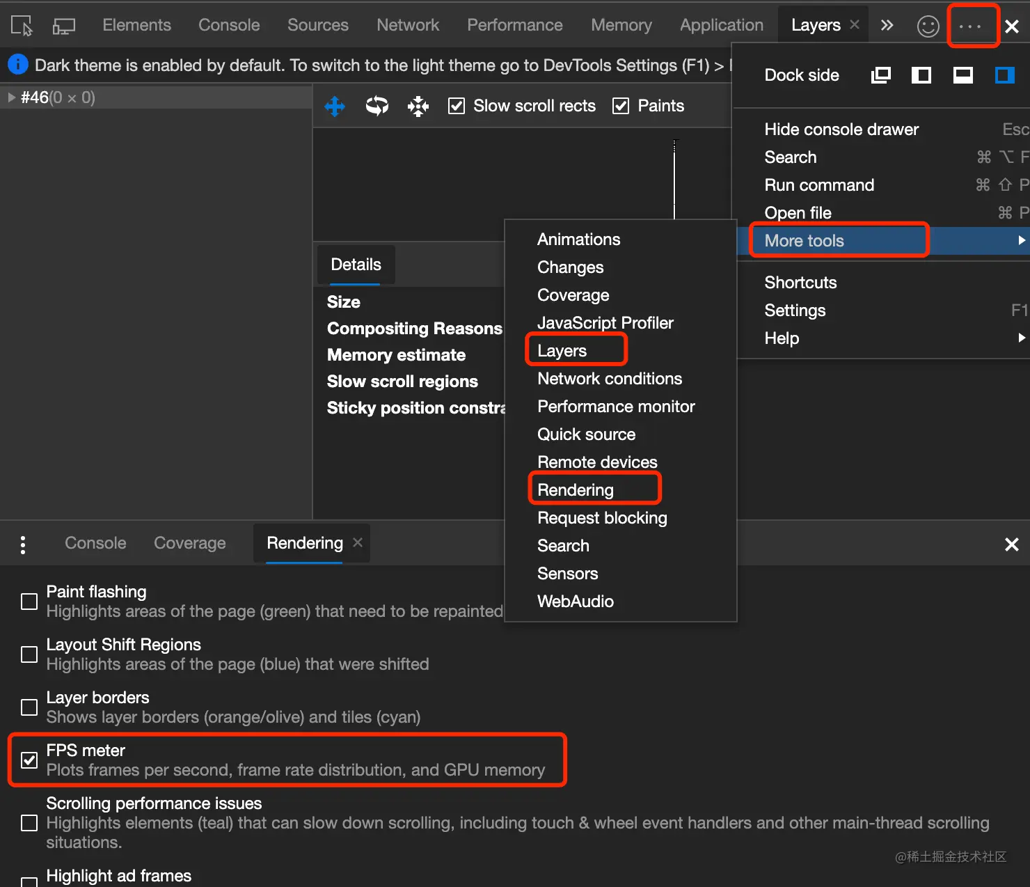 在浏览器的 Dev Tools 中选择 More tools,并勾选 Rendering 中的 FPS meter
