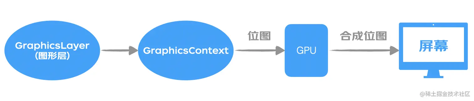 那么位图是怎么获得的呢,Graphics Layer 便起到了关键作用,每个 Graphics Layer 都有一个 Graphics Context, 位图是存储在共享内存中,Graphics Context 会负责将位图作为纹理上传到GPU中,再由GPU进行合成渲染。如下图: