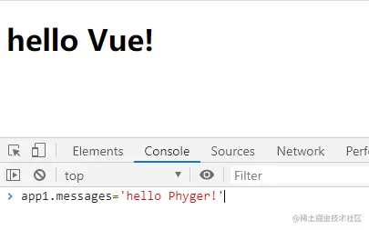 我们可以在控制台对 Vue 对象的数据元素进行修改,查看 DOM 会不会同步变化。