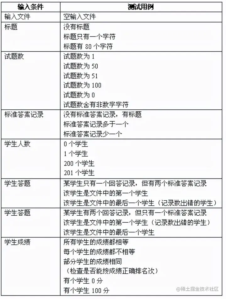 解答:分别考虑输入条件和输出条件,以及边界条件。给出下表所示的输入条件及相应的测试用例。