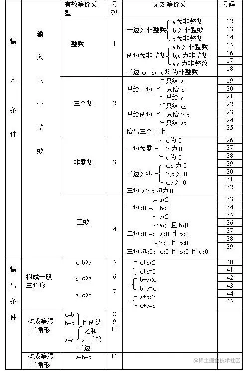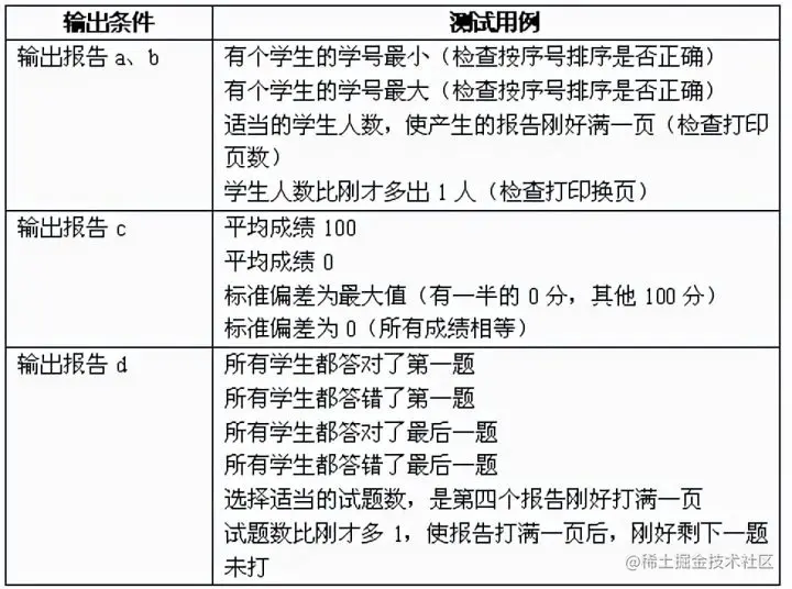 输出条件及相应的测试用例表。